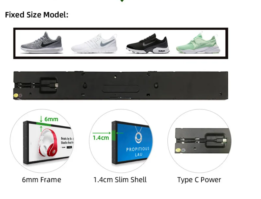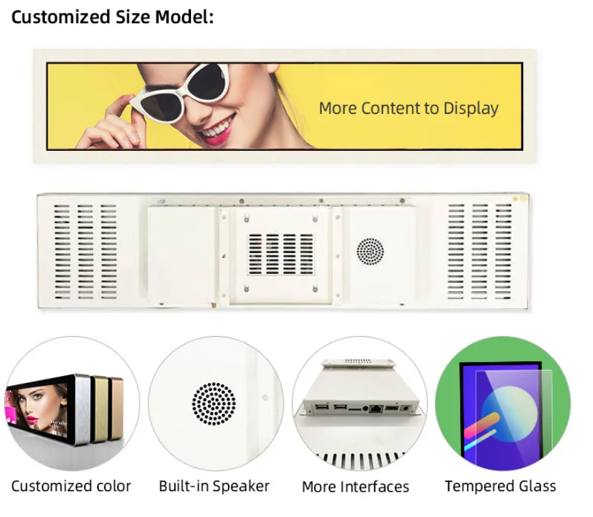 Maximize your productivity and elevate customer engagement with our advanced LCD Digital Bar Screen — a multifunctional, ultra‑wide display designed for modern indoor environments. Ideal for advertising, retail shelves, shopping malls, transportation hubs, hospitality, and corporate spaces, this stretched LCD display delivers exceptional clarity and performance in a compact, elongated form factor.